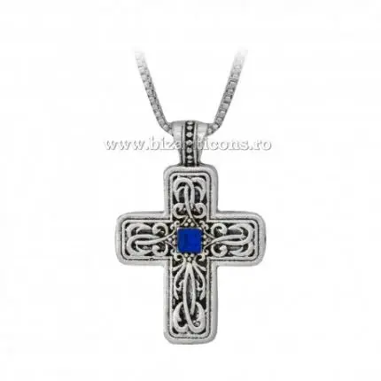Colier cu Cruce din Metal – Piatra Albastră, Produs Ortodox Românesc