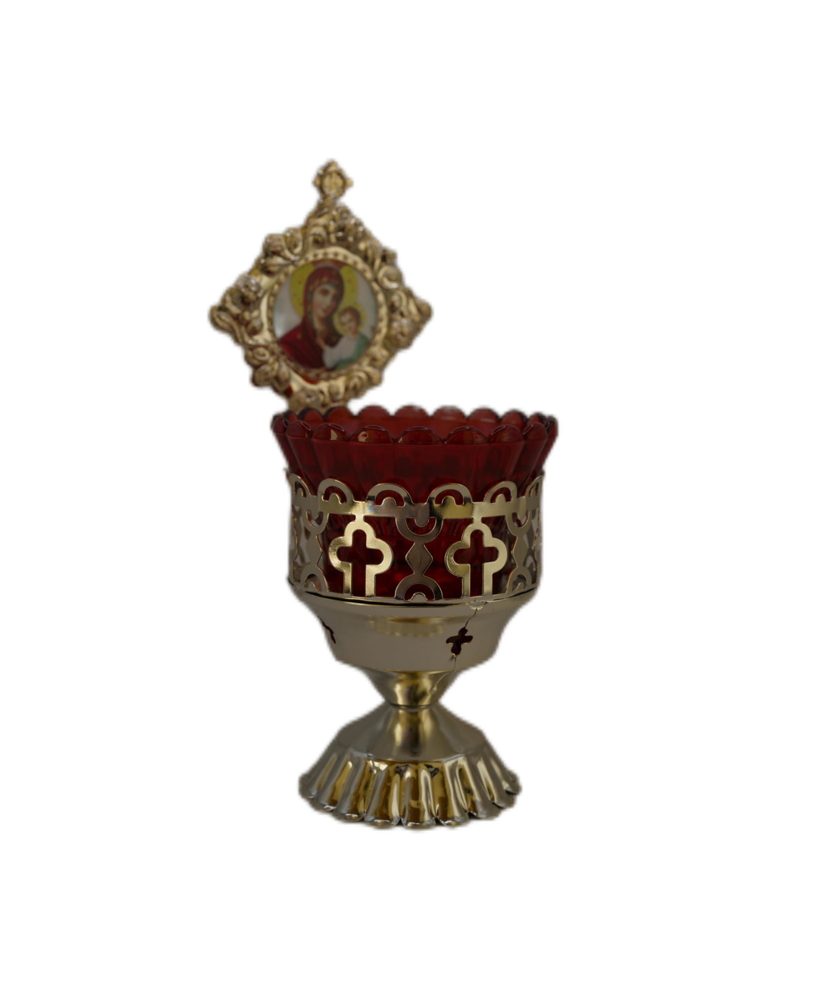 Gran cirio ortodoxo de metal perforado con la imagen de la Virgen y el Niño. Ideal para rincón de oración o decoración espiritual.