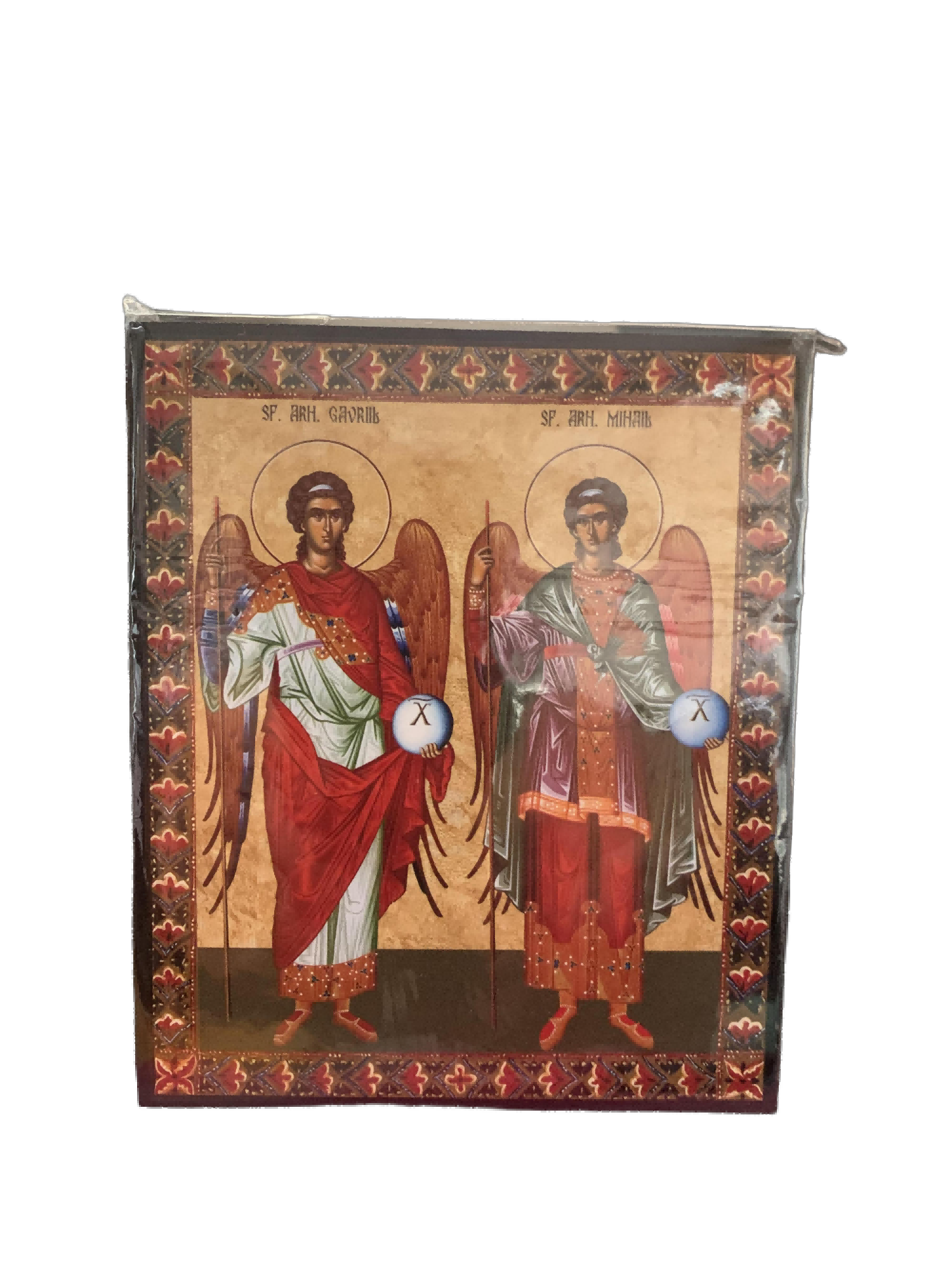 Această icoană ortodoxă de mici dimensiuni (12 x 10 cm), litografiată pe suport PAL, îi reprezintă pe Sfinții Arhangheli Mihail și Gavriil, doi dintre cei mai importanți îngeri pomeniți în Sfânta Scriptură și în tradiția ortodoxă. Este o icoană bizantină clasică, plină de simbolism, potrivită pentru orice casă sau colț de rugăciune.