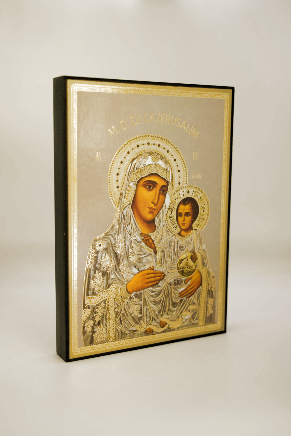 Icono litografiado de la Madre de Dios de Jerusalén, 16×11 cm, sobre soporte de aglomerado. Representación clásica de la protección y la misericordia maternas.
