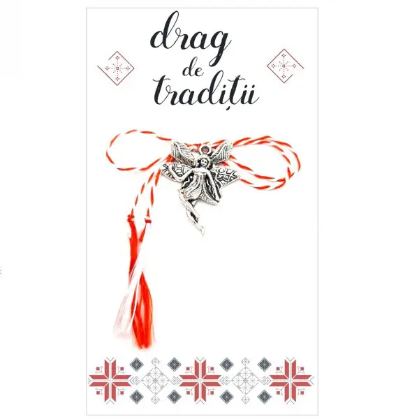 Pandantul este confecționat din aliaj de argint tibetan, un material ușor și rezistent, cu aspect antichizat, perfect pentru a sublinia tema mitologică. Este prins de clasicul șnur alb-roșu, element tradițional care leagă simbolul cu primăvara și norocul.
