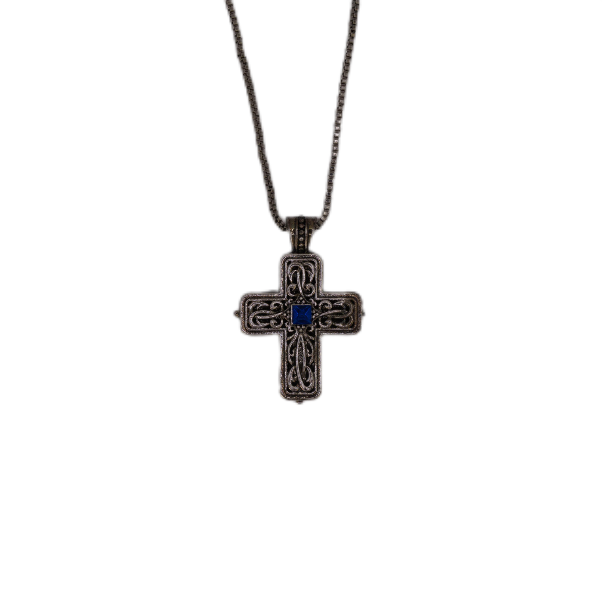 Colier cu cruce din metal și piatră albastră, ideal ca accesoriu religios sau cadou cu semnificație. Sfințit înainte de expediere și livrat rapid din Spania.