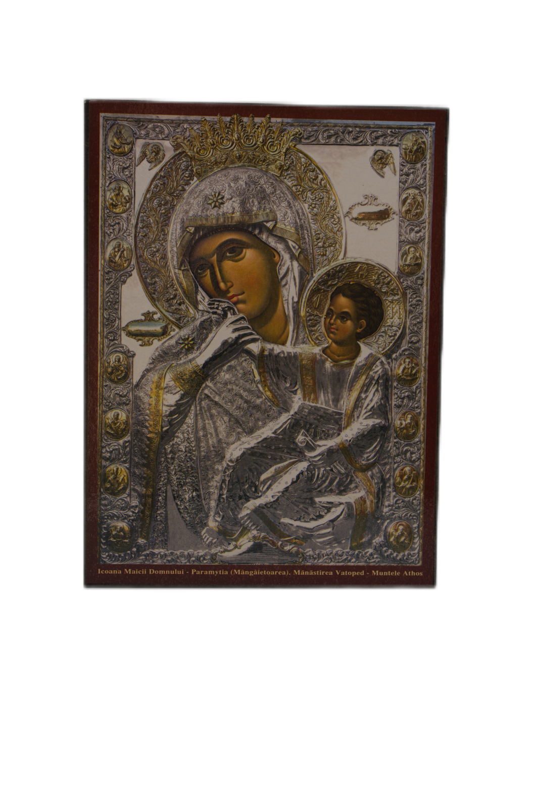 Icoană pe lemn sfințită – Maica Domnului Paramythia (Mângâietoarea), 14×19 cm. O icoană cunoscută pentru ajutorul grabnic, mângâierea sufletului și ocrotirea familiei în momente de teamă, grijă sau încercare.