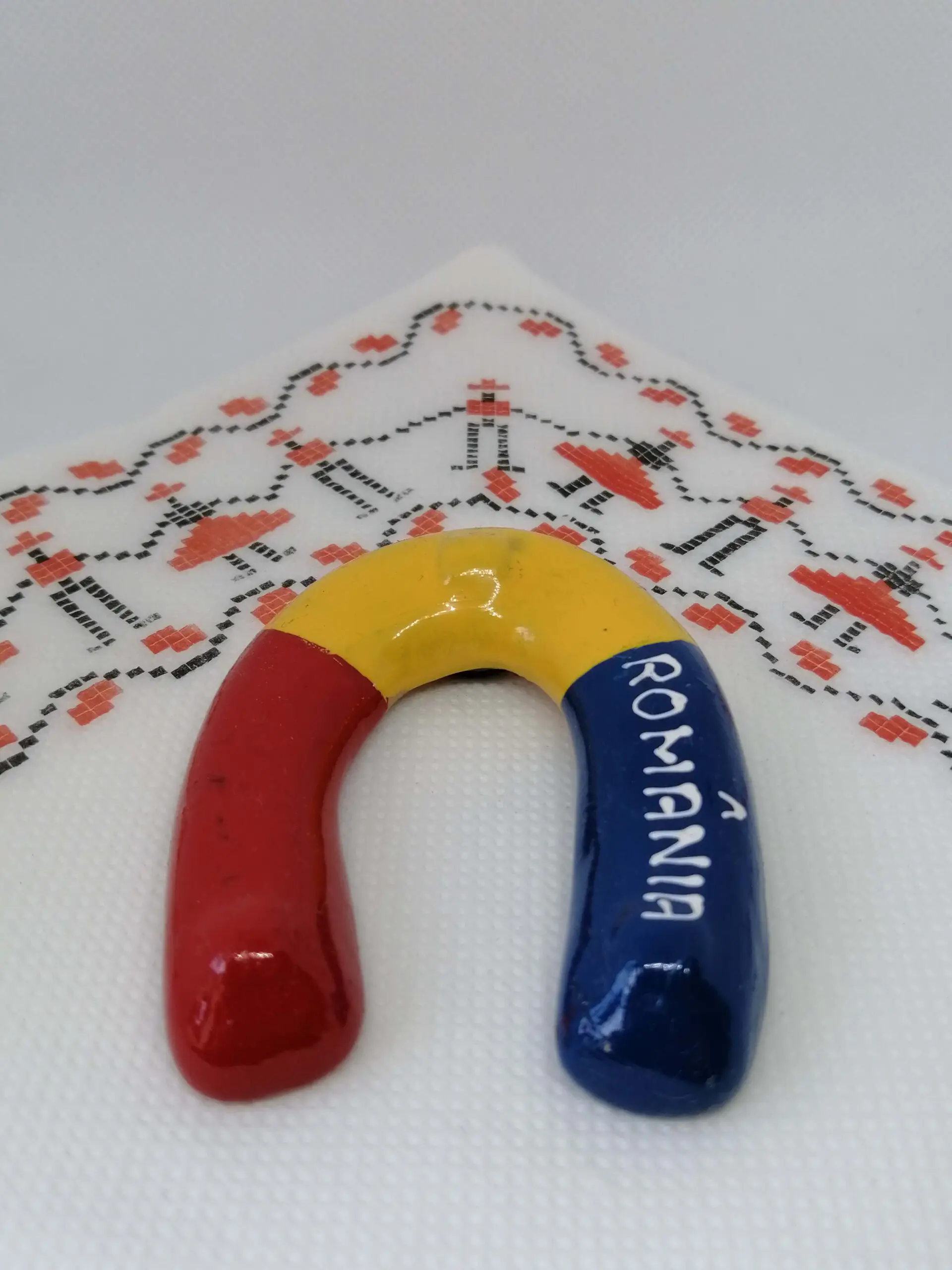 Magnet decorativ în formă de potcoavă, cu motive tradiționale românești și tricolor. Suvenir cu noroc, ideal pentru frigider sau cadou simbolic.